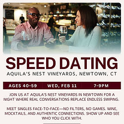 Ready to meet local singles face-to-face? Join us for a fun, low-pressure evening of meaningful connections! Ditch the swiping and come meet real, local singles in person! If you're tired of the same old routine, this is your chance to mix things up, meet new people, and have fun putting yourself out there! Our speed dating events make it easy and natural to spark connections—without the pressure of a full date. Note on Age Range: While this event is primarily focused on singles in the age range specified in the title, this is only a suggestion—not a strict requirement. If you're slightly outside this range but feel you'd connect well with this group, you're welcome to join! Our goal is to create well-balanced events where everyone can meet compatible matches. How the Evening Unfolds Casual Mixer Kickoff: The night starts with a relaxed mingle where you can grab a drink (not included, but encouraged) and ease into the atmosphere before the dating rounds begin. Guided Conversations: Not great at starting conversations? No worries! We provide an icebreaker question each round, and our high-energy host keeps things flowing smoothly. Perfect-Length Connections: You'll have just enough time with each person to feel out their vibe before moving on to meet someone new—all in a positive, supportive, lighthearted, pressure-free atmosphere. Important Details ⏰ Arrive 15–30 minutes early to settle in! We start promptly, and late arrivals may not be accommodated. Each ticket includes one wine or non-alcoholic drink. Additionally, gratuity for our staff is included in the ticket price. Upon arrival, you can pick up your drink at the tasting room bar after signing in and having your ID checked by our staff. Aquila's Nest offers a variety of non-alcoholic options to suit your preferences. Outside Alcohol Beverages, Water Bottles or Any Other Beverages are NOT allowed to be brought in the premises of the vineyard. This is a restriction of our Farm Winery Permit. Our staff reserves the right to check bags and coolers. All participants must be 21 years of age or older. CANCELLATION POLICY Ticket is non refundable. BOOKING INSTRUCTIONS Please check availability and book this event directly through our event partner's website. Copy and paste the following URL: https://www.eventbrite.com/e/speed-dating-ages-40s-50s-in-newtown-ct-at-aquilas-nest-vineyards-tickets-1978756368565