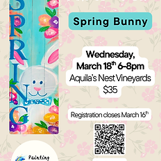 Join Painting on the Gogh at Aquila's Nest Vineyards to herald in spring with this floral bunny board! 🌸🐰 This will be on a wooden 3/4" thick board approximately 6x12 inches. This is NOT porch leaner size, but you can hang or lean on a shelf. All materials are included in the price and you'll be guided through step-by-step instructions. No painting experience is needed! Wine is not included in the ticket. A drink purchase of minimum $10 plus tax and gratuity per participant is required to attend this event and can be made at the vineyard prior to the start of the event, after our staff checks your ID. Aquila's Nest has many non-alcoholic options as well. Outside Alcohol Beverages, Water Bottles or Any Other Beverages are NOT allowed to be brought in the premises of the vineyard. This is a restriction of our Farm Winery Permit. Our staff reserves the right to check bags and coolers. All participants must be 21 years of age or older. CANCELLATION POLICY Ticket is non refundable. BOOKING INSTRUCTIONS Please check availability and book this event directly through our event partner's website. Copy and paste the following URL: https://www.paintingonthegoghct.com/event-details/spring-bunny-35
